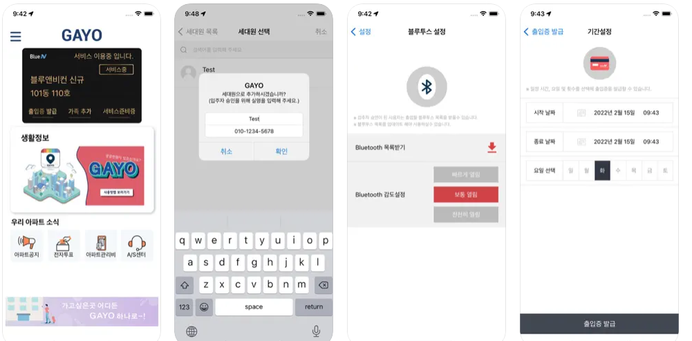 이 앱은 블루투스 및 NFC 기술을 사용하여 사용자가 건물에 접근하면 자동으로 열리는 시스템으로, 사용자를 인식하고 양손에 짐이 있을때 자동으로 문을 열어줍니다. 특히 쇼핑 여행이나 물건을 들고 다닐 때 적합합니다. 가요( GAYO )앱은 블루투스 원패스 시스템은 공동현관 무인 자동 출입 시스템입니다,